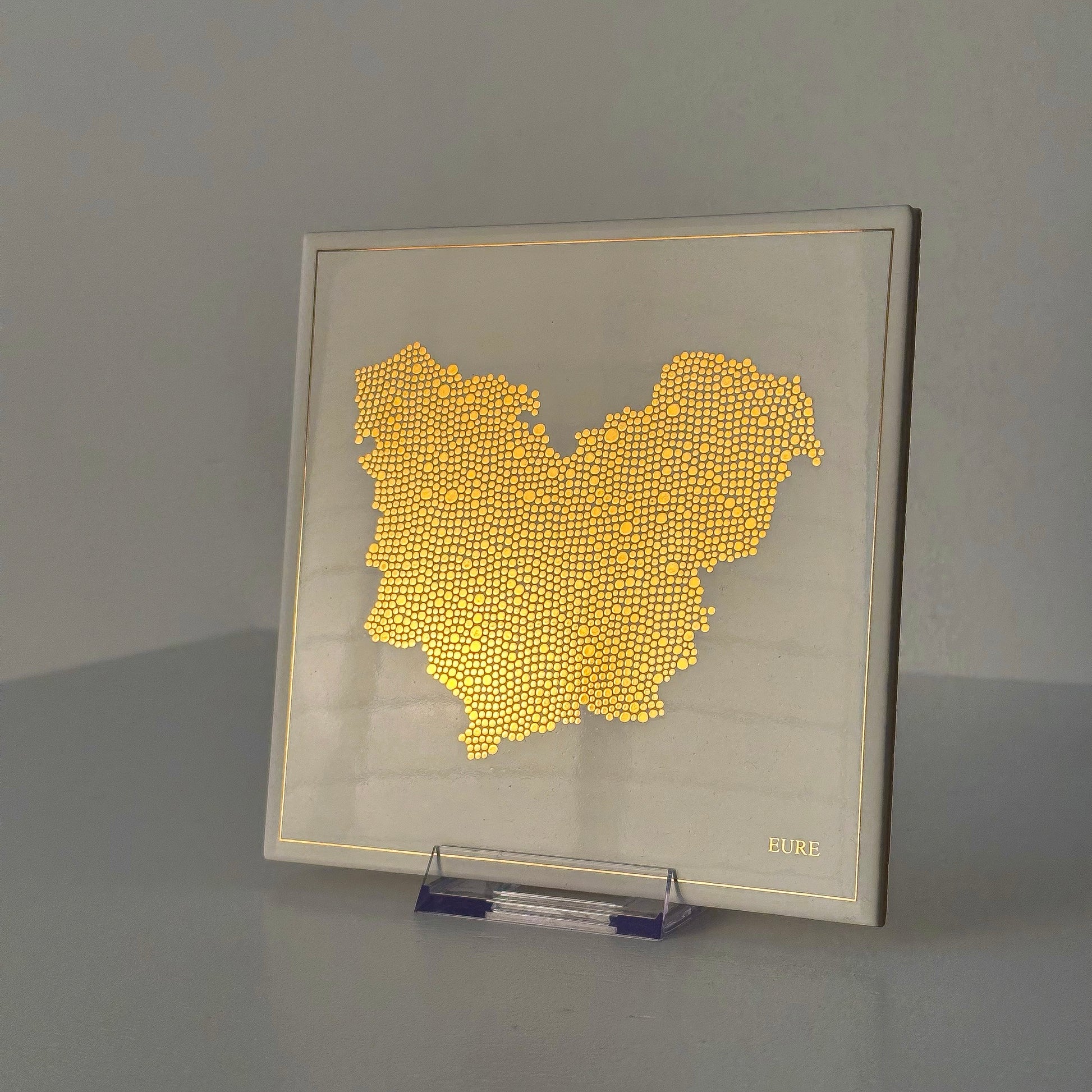 Depending on the angle and the light, the gold reveals shifting reflections, sometimes subtle, sometimes dazzling: that's the magic of this technique. On this model, the name Eure is discreetly inscribed on the tile, adding a touch of elegant memento.