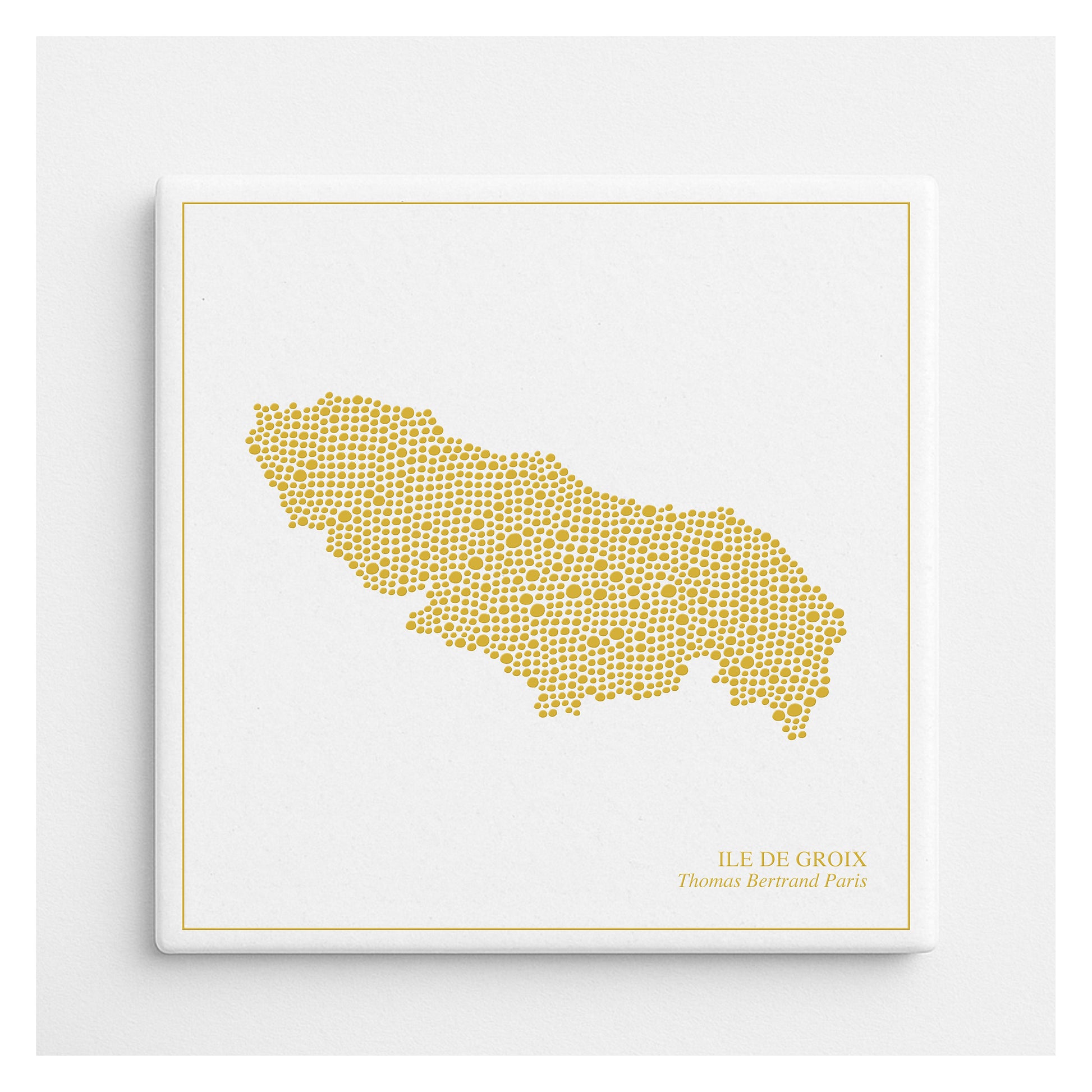 Selon l'angle de vue et la lumière, l'or révèle des reflets changeants, tantôt subtils, tantôt éclatants : c'est toute la magie de cette technique. Sur ce modèle, le nom Groix est discrètement inscrit sur le carreau, ajoutant une touche de souvenir élégant.