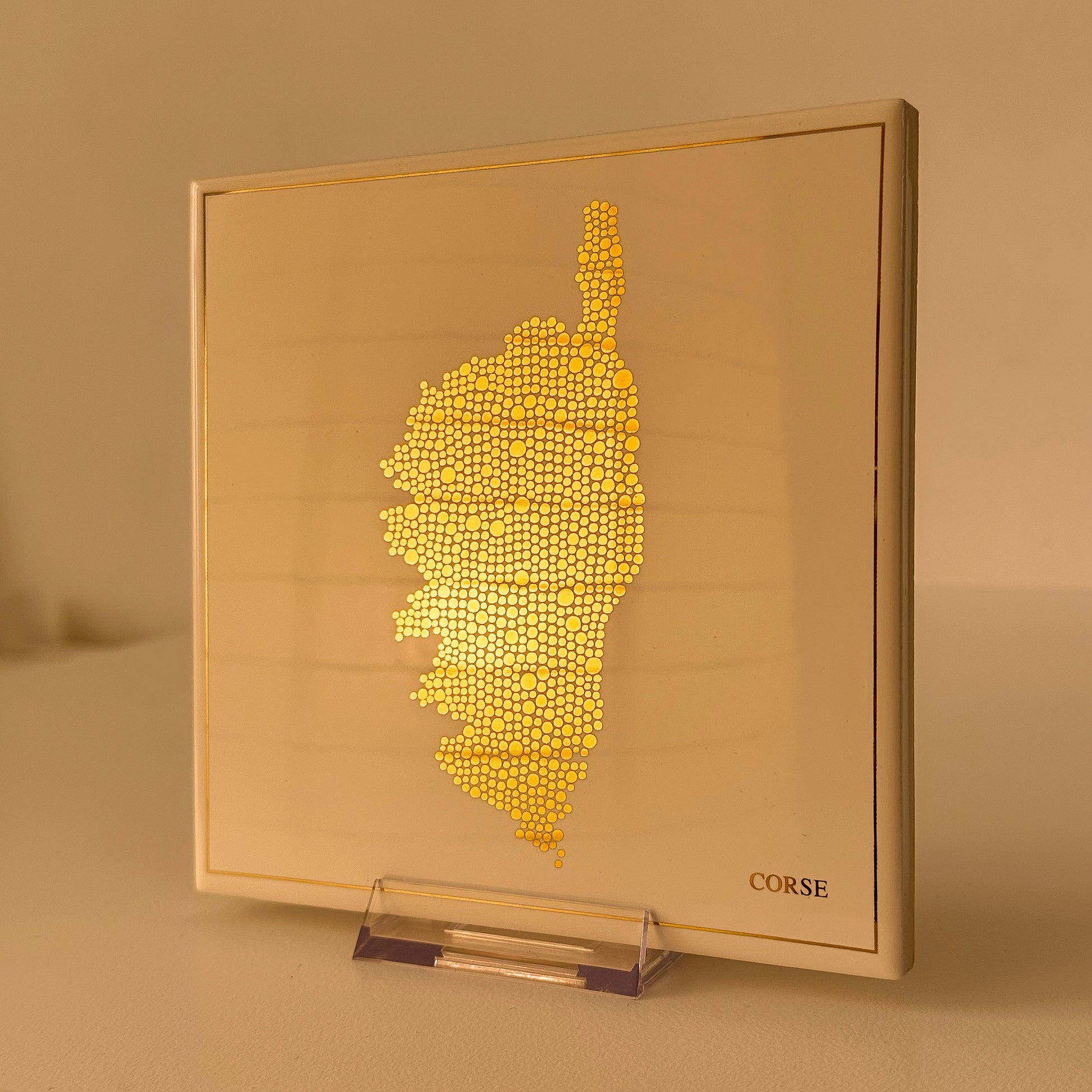 Selon l'angle de vue et la lumière, l'or révèle des reflets changeants, tantôt subtils, tantôt éclatants : c'est toute la magie de cette technique. Sur ce modèle, le nom Corse est discrètement inscrit sur le carreau, ajoutant une touche de souvenir élégant.